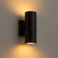 Strakke zwarte wandlamp voor buiten met IP44 bescherming. Geschikt voor twee GU10 LED-lampen. Ideaal voor gevels, terrassen en tuinmuren. Modern design dat elke buitenruimte stijlvol verlicht.